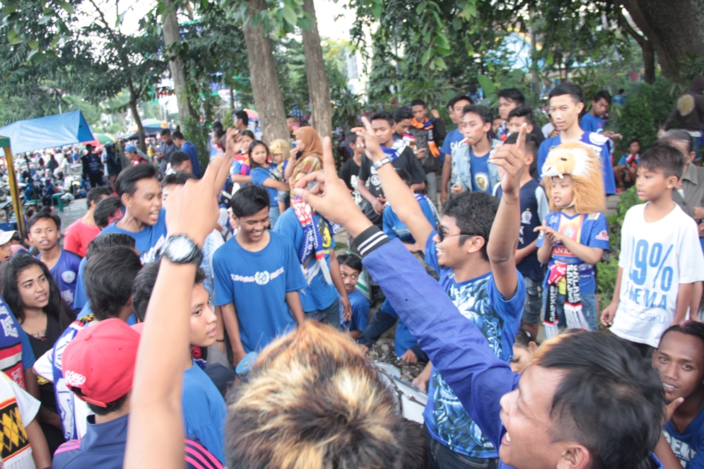 Untuk merayakan kegembiraan, sekelompok Aremania memilih untuk bersenang-senangdan terus bernyanyi bersama.