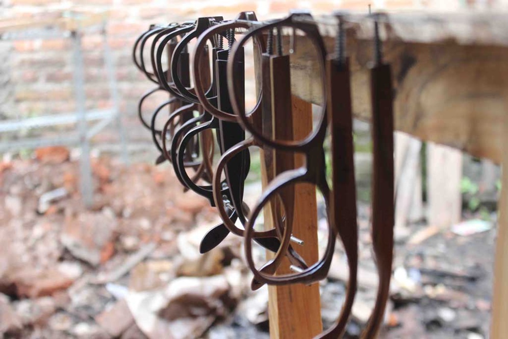 Frame kacamata kayu saat didiamkan hingga kering usai proses pengecatan.
