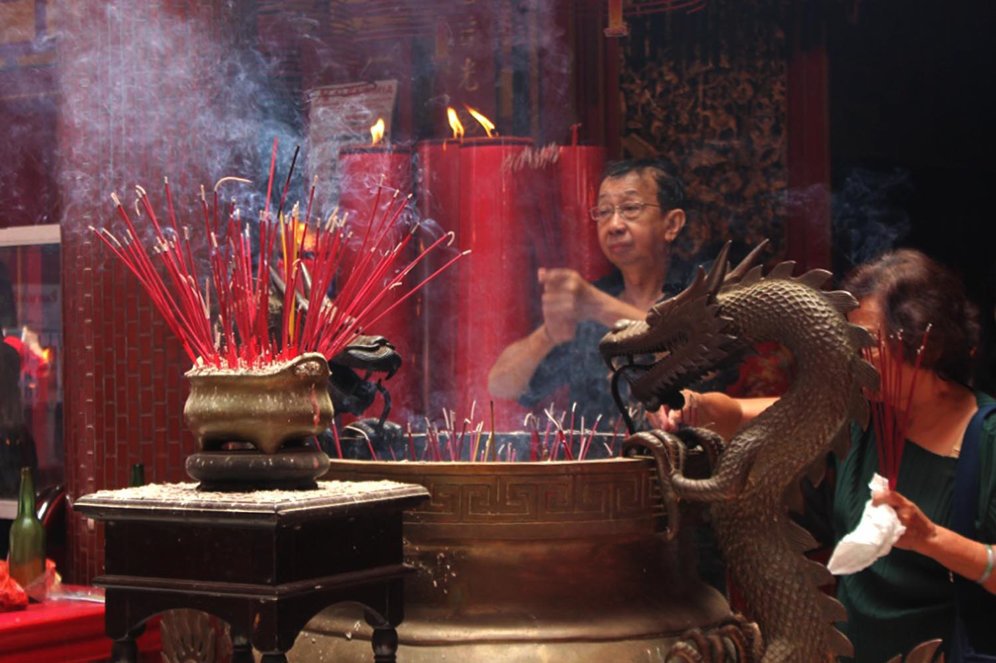 Usai atraksi barongsai, selanjutnya digelar acara persembahyangan di ruang utama klenteng. Bunyi lonceng menandakan upacara segera dimulai.