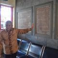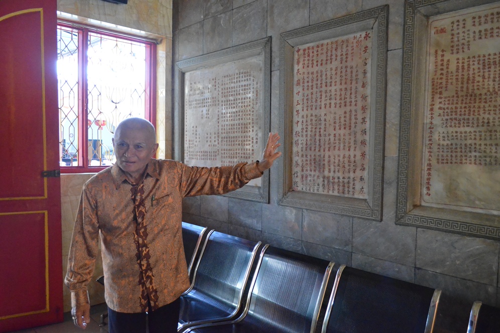 Bunsu Anton, Humas sekaligus Rohaniawan di Kelenteng Eng An Kiong saat menjelaskan tentang tulisan-tulisan Cina yang menyerupai prasasti. Tulisan yang tertera di tembok Kelenteng tersebut berisi nama orang-orang yang berjasa dalam pembangunan Kelenteng Eng An Kiong.