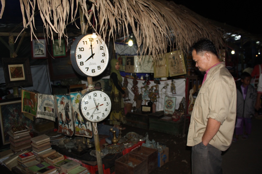 Seorang pengunjung sedang melihat-lihat buku dan benda-benda kuno.