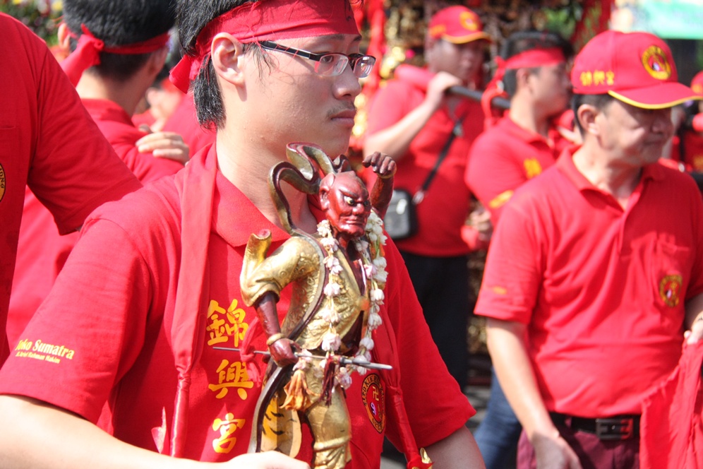 Salah satu peserta dari Kelenteng T.I.T.D Kim Hin Kiong, Gresik membawa patung dewa dalam kegiatan kirab ritual dan budaya.