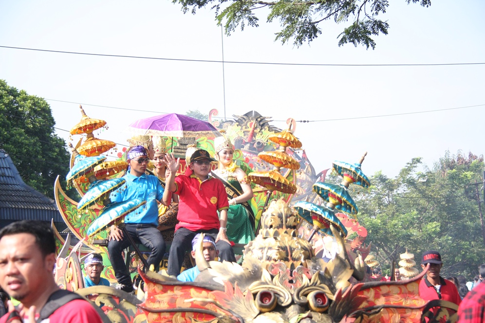Wakil Walikota Sutiaji menyapa masyarakat yang menyaksikan dari atas kereta kencana Kelenteng Eng An Kiong, Kota Malang.