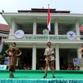 Seorang model saat memperagakan busana batik Tjelaket Malangan di halaman Balai Kota Malang, Malang, Jawa Timur, Senin (2/10). Peragaan busana bertajuk 'fashion on the street' ini digelar dalam rangka memperingati Hari Batik Nasional.