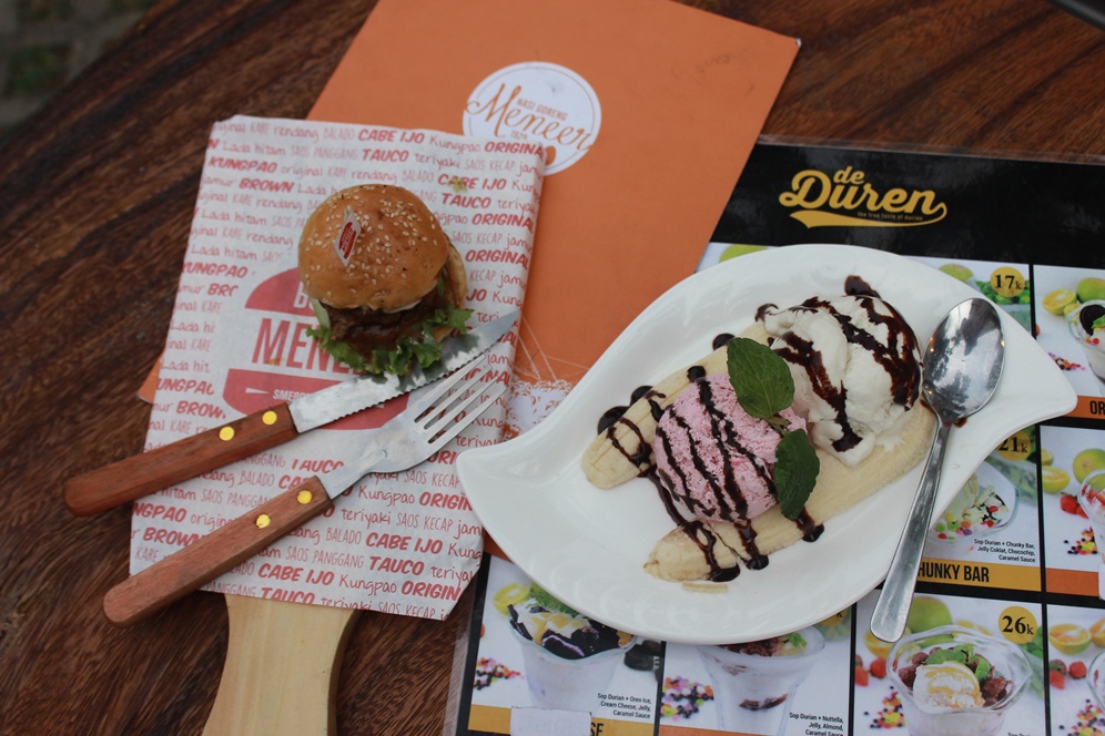 Menjadi menu andalan DeDuren, Banana Split hadir dengan perpaduan antara pisang premium, es durian, dan es strawberry yang disiram dengan saus cokelat yang lezat. Menjadi menu andalan Burger Meneer, burger ukuran S berisi daging giling murni 30gr. Burger Meneer hadir dengan enam varian saus lezat. Sebut saja, saus cabe ijo, rendang, sambalalo, saus panggang, dan lainnya.