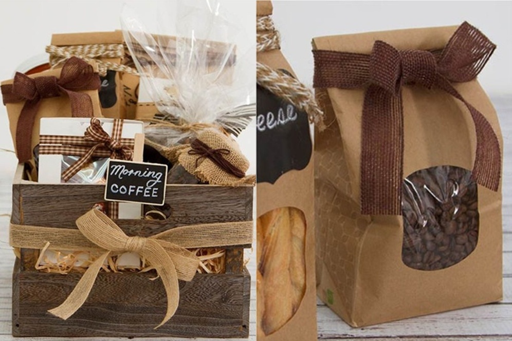 Jika kamu memilih tema kopi, kamu bisa mengisis kantong kertas makanan dengan biji atau bubuk kopi. Sebagai pelengkap, tata kue kering dalam kotak kue dan cangkir atau mug kopi.