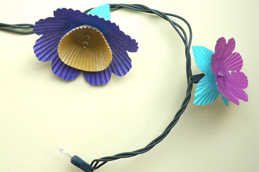Masukkan lampu string ke dalam bunga kertas satu persatu mengikuti pola di gambar.
