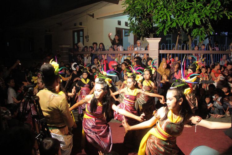 Merdeka.com, Malang - Ratusan warga mulai dari anak kecil hingga orang tua menyemut di depan panggung yang tidak terlalu besar di perempatan sebuah kampung yang terletak di wilayah jalan Dieng Atas. Tampak beberapa penari dengan usia yang cukup muda bergerak seirama dengan luwes menampilkan tarian yang cukup memukau penonton yang berjubel.