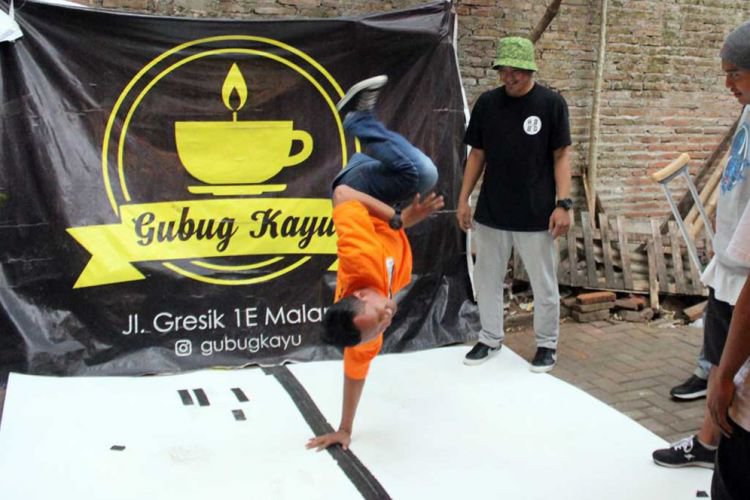 "Aku mulai belajar breakdance sejak 2005, saat kondisi badan saya masih normal, memiliki dua kaki," kata Arif Setyo Budi di tempat usahanya, Gubuk Kayu Cafe Jalan Gresik 1E Kota Malang, Selasa (31/10).