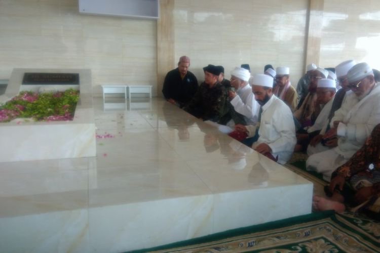 Abah Anton didampingi pasangannya berdoa khusus di makam ibunya. Keduanya didampingi sejumlah kyai membaca tahlil dan berdoa kepada almarhummah.