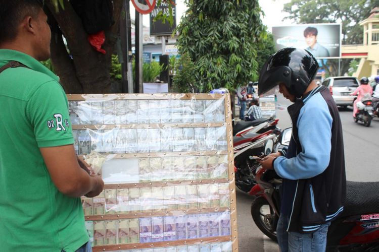 Sejak awal puasa, para penjaja jasa penukaran uang itu menawarkan jasanya di pinggir jalan. Mereka membawa papan yang digunakan menaruh uang-uang baru.