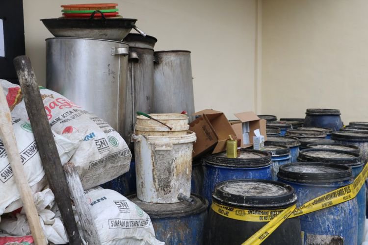 Barang bukti yang diamankan berupa 7 sak gula pasir 50 Kg, 3 sak gula pasir 1/2 sak, 1 sak beras ketan putih, 10 pak ragi saft instans, 8 pak ragi fermipan, 1 zak bungkus ragi, 3 buah dandang, 2 wajan, 4 ember, 1 corong, 1 gayung, 4 keranjang, 6 jerigen, 34 tong campuran fermentasi, 24 jerigen cairan, 1/6 jerigen miras trobas jadi, dan 1 unit mobil Mitsubishi T120, N-8586-DF.