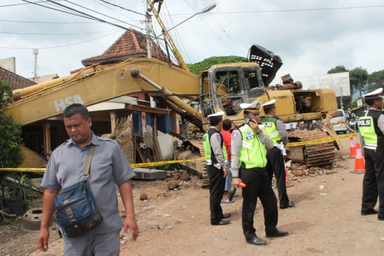 Ekscavator alias Beko jatuh dari truk trailer pengangkutnya di Batu, Jawa Timur hingga menimpa 9 buah rumah.