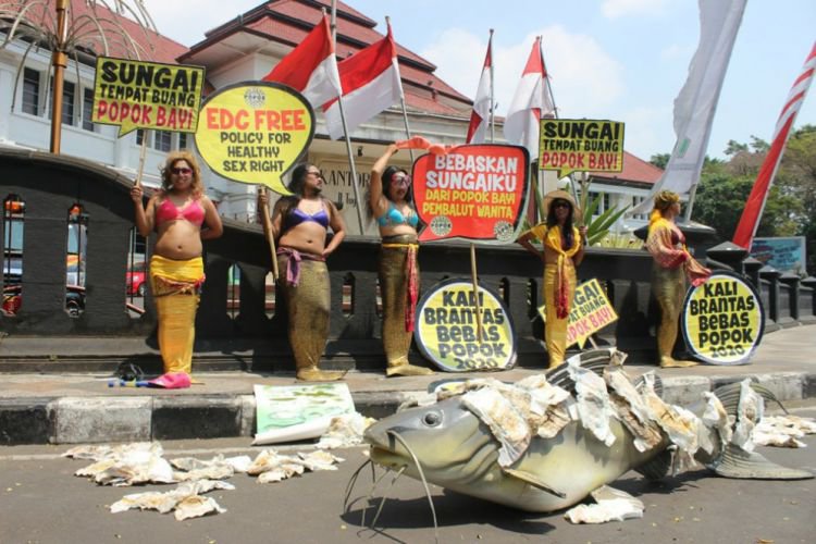 Brigade Evakuasi Popok (Kuapok) Ecological Observation and Wetlands Conservation (Ecoton) mengampanyekan gerakan mengentaskan Kali Brantas dari teror popok bekas bayi.