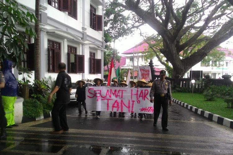 Dilansir dari merdeka.com, dalam aksinya mereka membawa berbagai poster bertuliskan 'Selamat Hari Tani', 'Tolak Alih Fungsi Lahan', 'Transparansi Dana Pertanian', 'Berikan Subsidi ke Petani'. Selain itu juga membawa sebuah orang-orangan sawah bertulis 'Di mana Lahan Kami'. Massa pun mengenakan caping petani dan aneka poster, berorasi di tengah guyuran hujan deras.