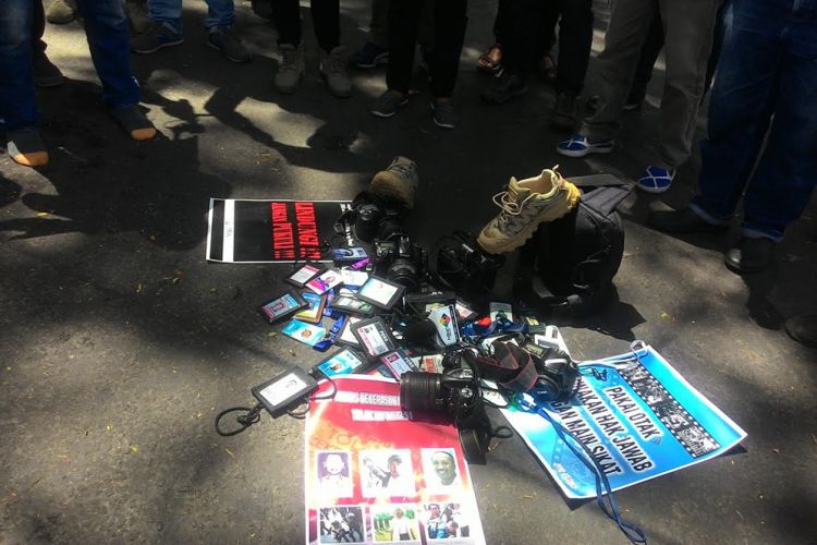 Sementara dalam aksinya, para jurnalis mengumpulkan ID card dan kamera. Selain itu, dua pasang sepatu both tentara melambangkan arogansi TNI. Secara bergiliran, para jurnalis menyampaikan orasinya.