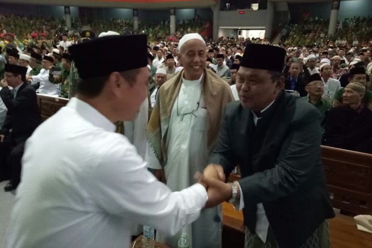Merdeka.com, Malang - Kebersamaan dan rasa persatuan antar komponen masyarakat tercermin di acara Halal bi Halal Keluarga Besar Nahdlatul Ulama (NU) dan Muhammadiyah Kota Malang. Ribuan massa memadati Gedung Graha Cakrawala, Universitas Negeri Malang, Minggu (6/8).