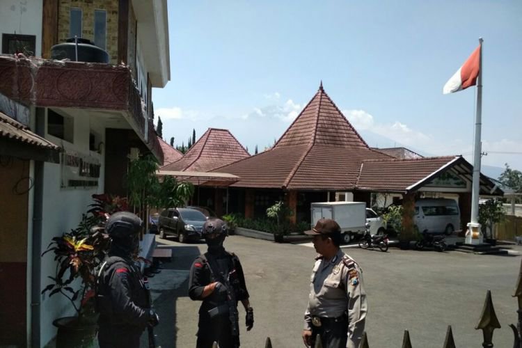 Para petugas yang melakukan penggeledahan mendapatkan pengawalan ketat dari petugas keamanan. Tampak personel Brimob bersenjata laras panjang, berkostum hitam lengkap dengan penutup kepala, berjaga di depan pintu.
