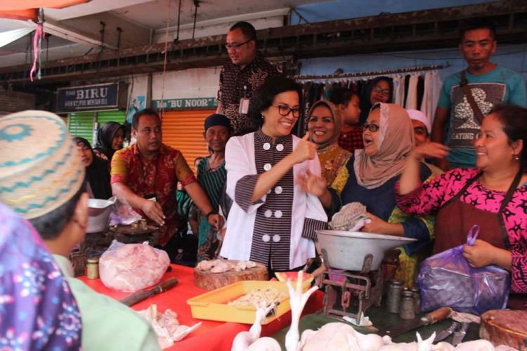 Mantan Presiden Bank Dunia itu berdialog dengan para penjual ayam potong dan sayur-sayuran. Bahkan, ia sempat menikmati es degan yang dibeli dari seorang penjual kaki lima. Sepanjang berjalan menuju lokasi, Menteri Sri menyapa para pedagang dan melayani berfoto selfie.