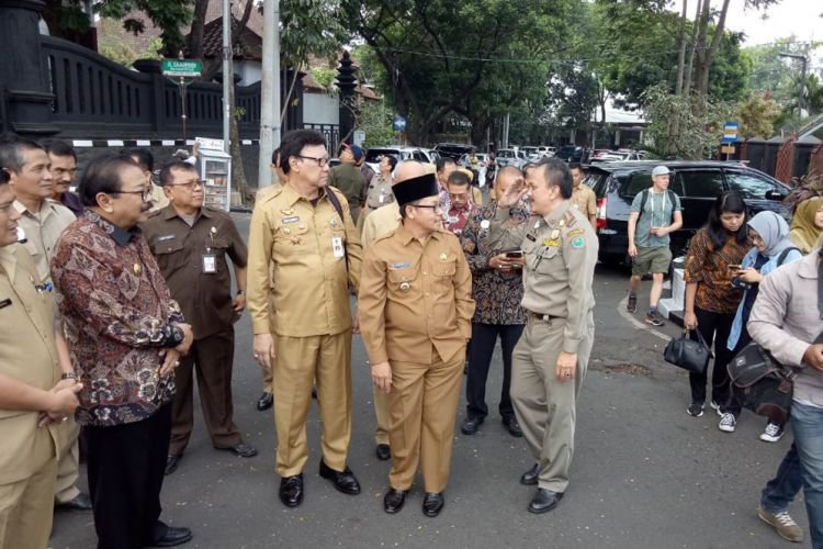 Merdeka.com, Malang - Menteri Dalam Negeri (Mendagri) Tjahjo Kumolo dan Gubernur Jawa Timur Soekarwo mendadak muncul di Balai Kota Malang. Keduanya melakukan inspeksi dengan didampingi Wali Kota (Plt) Sutiaji menuju ke sejumlah ruang kerja di lingkungan Pemkot Malang.