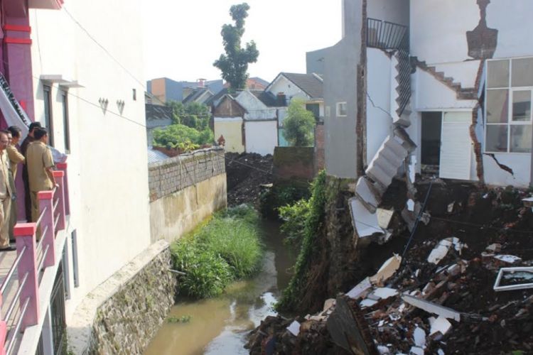 "Yang tinggal satu keluarga ada 5 orang. Saat kejadian memang sudah dikosongkan karena sudah retak-retak. Habis hujan besar kemarin langsung ambrol," kata Novrianto di depan rukonya, Senin (6/3).