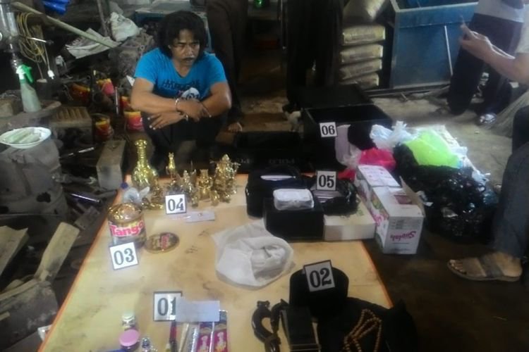 Polisi berhasil menangkap tersangka berikut sejumlah barang bukti yang digunakan untuk proses ritual di antaranya duparatus, 17 botol minyak wangi berbagai merk, botol kemenyan.