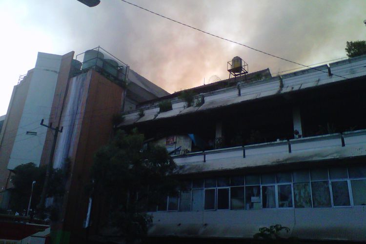 Pantauan Merdeka.com di lokasi, asap tebal membumbung dari pasar berlantai tiga itu. Sementara api menyala terlihat dari balik tenda.