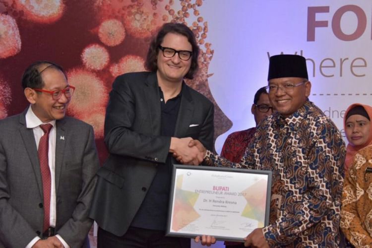 Merdeka.com, Malang - Bupati Malang, Rendra Kresna, meraih penghargaan bergengsi dalam acara Kellogg Inovation Network (KIN) ASEAN 2017 di Ritz Carlton, Jakarta, Rabu (6/12). Dalam acara yang digelar Mark Plus Inc. itu, Rendra berhasil menyabet Bupati Entrepreneur Award 2017, kategori Kesehatan dan Pariwisata.