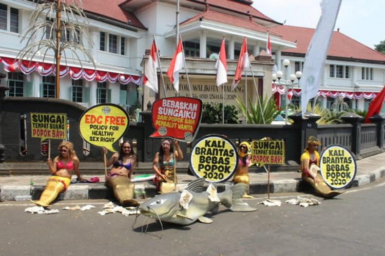 Lima putri duyung ini memegang berbagai tulisan, di antaranya 'Bebaskan Sungaiku Dari Popok Bayi dan Pembalut Wanita', 'Stop Sungai Sebagai Tempat Buang Popok Bayi', 'Sungai Brantas Bebas Popok 2020', 'ECD Free Policy for Healthy Sex Right'.