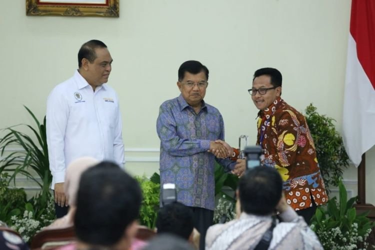Wakil Presiden Jusuf Kalla didampingi Menteri Pendayagunaan Aparatur Negara dan Reformasi Birokrasi (PANRB) Syafruddin, menyerahkan penghargaan tersebut di di Istana Wakil Presiden di Jakarta.