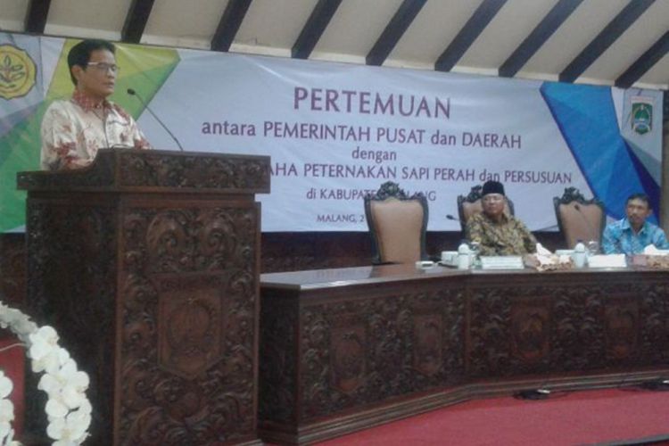 Merdeka.com, Malang - Berupaya mewujudkan swasembada daging, pemerintah tingkatkan hasil Inseminasi Buatan (IB) dan pencanangan Upaya Khusus Sapi Indukan Wajib Bunting (Upsus Siwab). Tak hanya swasembada daging, program tersebut sekaligus akan meningkatkan kesejahteraan petani ternak di Indonesia. Program tersebut dipaparkan dalam kunjungan Dirjen Peternakan dan Kesehatan Hewan Pertanian Indonesia, drH. I Ketut Diarmita MP ke kabupaten Malang, Jumat (2/12) malam. Kunjungan tersebut diterima langsung oleh Bupati Malang, Rendra Kresna.