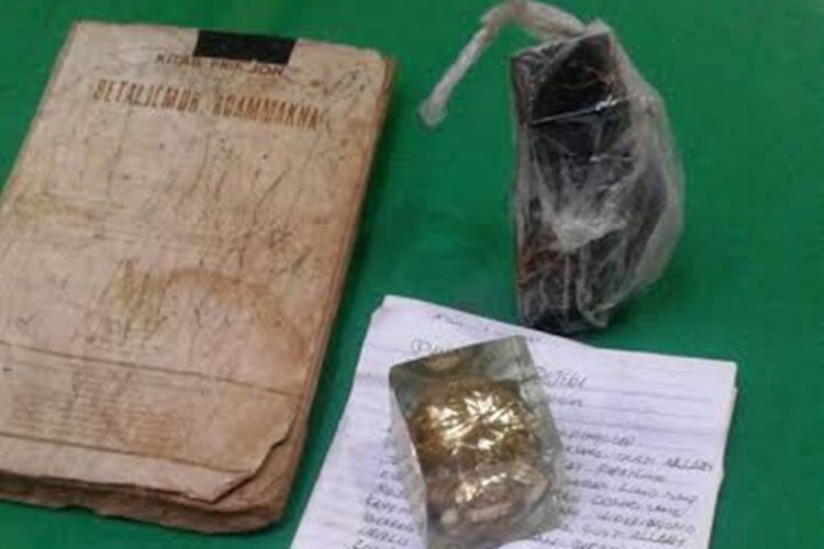 Polisi, kata Vicky, mengamankan buku primbon dan sebuah barang berbentuk segi empat yang di dalamnya tergambar menyerupai buah. Selain itu juga menyita sebuah tulisan tangan dalam bahasa Jawa yang diduga sebagai alat untuk menipu korbannya.
