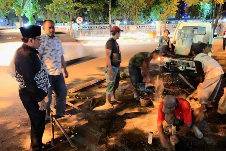Merdeka.com, Malang - Pengerjaan perbaikan jalan oleh Dinas Pekerjaan Umum dan Perumahan Rakyat (DPU-PR) disidak Wali Kota Malang, Sutiaji. Usai salat tarawih dan memberi ceramah Safari Ramadan di Masjid Al Falah Gadang, Sutiaji langsung meninjau proyek pengerjaan perbaikan decker jalan di pojok pertigaan Ramayana, Jalan Aries Munandar.