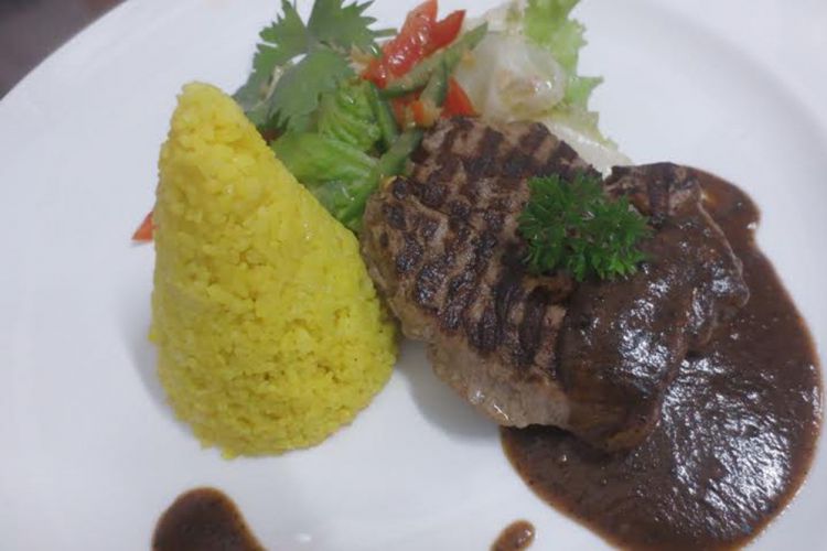 Steak daging panggang has dalam dari Australia yang “juicy”, disajikan dengan nasi kuning,sayuran dan saus gaya Hindia – Belanda tahun 1930-an.