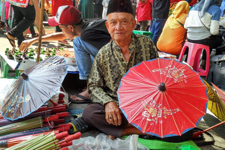 "Lo kalo jualan (payung kertas), saya sudah dari 45. Sejak Belanda mau masuk Surabaya dulu", cerita Mbah Rasimun yang ditemui malang.merdeka.com, Minggu (16/10).