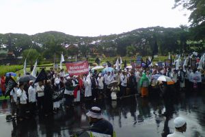 Di bawah guyuran hujan, massa HTI Malang minta Ahok dihukum berat